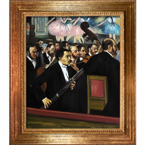 - framed oil reproduction of an original painting by edgar degas.Vienna wood frame - gold leaf finish.Framed painting size (not including frame): classic 20" x 24".100% handmade oil painting on artist grade canvas - certificate of authenticity included.Framed paintings arrive ready to hang on your wall with hanging hardware included. 20" X 24" Oil Painting On Canvas Hand painted oil reproduction of a famous Degas painting, The Orchestra at the Opera. The original masterpiece was created in 1868. Today it has been carefully recreated detail-by-detail, color-by-color to near perfection. Edgar Degas was born in Paris in 1834 and studied art from a young age. His most popular paintings were and still are his ballerina paintings like The Dance Class , Star Dancer (On Stage) , and Dance Studio at the Opera . Asymmetrical compositions like Two Dancers on Stage show the influence of the Japanese prints in which Degas became interested. His painting career was prematurely ended by failing eyesight, and he died in Paris in 1917. This work of art has the same emotions and beauty as the original.