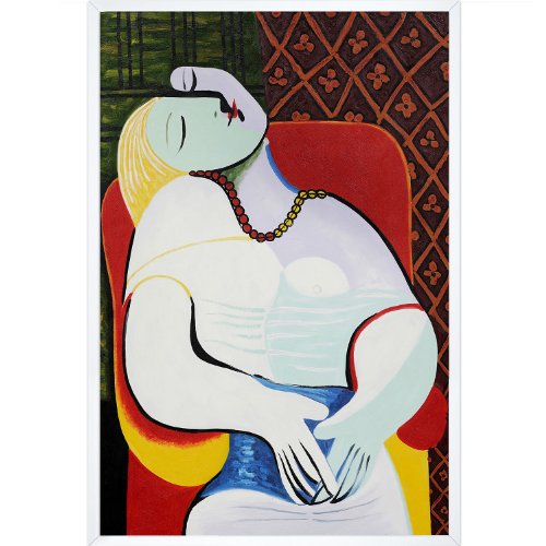 Framed painting size (exterior dimensions inches): 37.5-inch by 2-inch.Framed painting size (not including frame): large 24-inch x 36-inch.100-percent handmade oil painting on artist grade canvas - certificate of authenticity included.The dream - framed oil reproduction of an original painting by pablo picasso.Framed paintings arrive ready to hang on your wall with hanging hardware included. 24-inch by 36-inch oil painting on canvas transform a room in your home with the dream by cubism painter, pablo picasso (originally le reve in french). Painted in 1932, this painting supposedly depicts his mistress at the time, 24-year-old marie-therese walter.