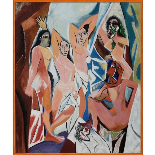 Framed painting size (not including frame): classic 20-inch by 24-inch.Framed oil reproduction of an original painting by pablo picasso.Studio tangerine metal frame - orange finish.100-percent handmade oil painting on artist grade canvas - certificate of authenticity included.Framed paintings arrive ready to hang on your wall with hanging hardware included. Hand painted oil reproduction of a famous Picasso painting, Les Demoiselles D'Avignon. It has been carefully recreated detail by detail, color by color to near perfection in order to preserve the sentiment and splendor of the original. Picasso was recognized by his father as a child prodigy by the age of 14. Pablo Picasso pioneered the modern art movement called Cubism and is widely acknowledged as the most important artist of the 20th century. This work of art has the same emotions and beauty as the original.