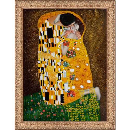 100-percent handmade oil painting on artist grade canvas - certificate of authenticity included The kiss (full-view) - framed oil reproduction of an original painting by gustav klimt Framed painting size (exterior dimensions inches): 37-inch by 2-inch Framed painting size (not including frame): extra large 30-inch x 40-inch Framed paintings arrive ready to hang on your wall with hanging hardware included