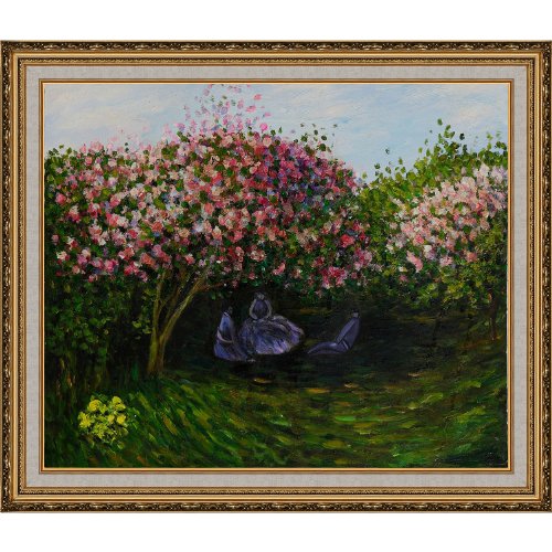 Resting under the lilacs - framed oil reproduction of an original painting by claude monet.Framed painting size (exterior dimensions inches): 25-inch by 2-inch.100-percent handmade oil painting on artist grade canvas - certificate of authenticity included.Framed painting size (not including frame): classic 20-inch x 24-inch.Framed paintings arrive ready to hang on your wall with hanging hardware included..