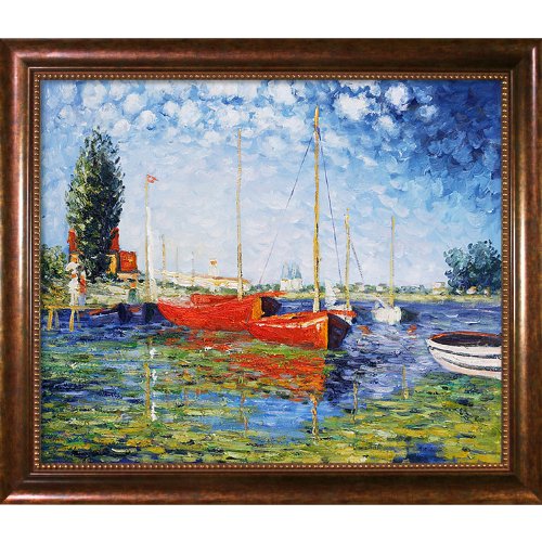 overstockArt Claude Monet Red Boats at Argenteuil Painting with Verona Cafe Coffee Brown Patina Finish with Bead Detail Feature