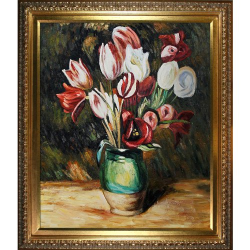 Framed painting size (exterior dimensions inches): 26-inch by 2-inch Framed painting size (not including frame): classic 20-inch x 24-inch 100-percent handmade oil painting on artist grade canvas - certificate of authenticity included Framed paintings arrive ready to hang on your wall with hanging hardware included Tulips in a vase - framed oil reproduction of an original painting by pierre auguste renoir