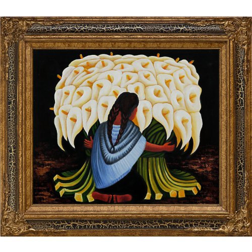 The flower seller c1942 - framed oil reproduction of an original painting by diego rivera Framed painting size (not including frame): classic 20-inch x 24-inch Framed painting size (exterior dimensions inches): 28-inch by 2-inch 100-percent handmade oil painting on artist grade canvas - certificate of authenticity included Framed paintings arrive ready to hang on your wall with hanging hardware included