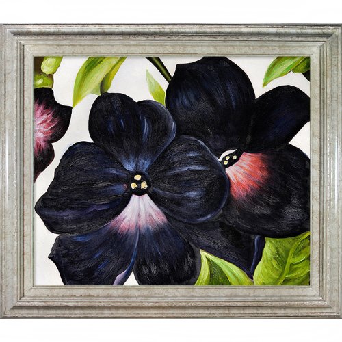 OverstockArt O'Keeffe Black and Purple Petunias with Tuscan Ivory Frame, Lightly Marbled White Wood Feature