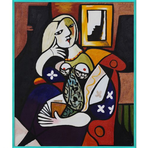 overstockArt Picasso Woman with Book Painting, Studio Turquoise Finish Metal Frame Feature